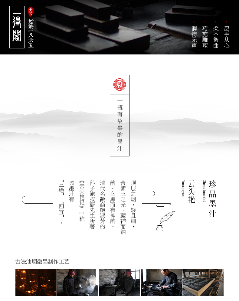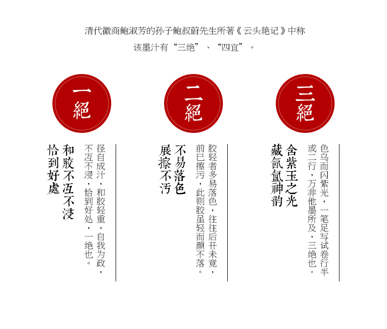 云頭艷墨汁“取頂層之煙,含紫玉之光,烏黑而有神韻,由如彩云般之艷逸?!痹祁^艷由此而