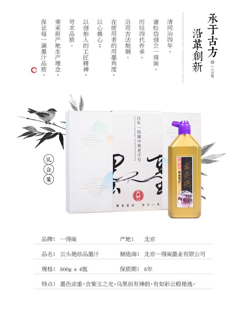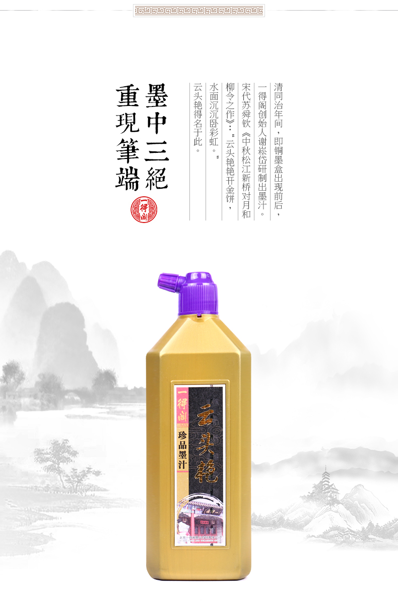 強,是工筆畫必備之材料。云頭艷墨汁是一得閣奉獻給書畫界的精制珍品,是藝術家創(chuàng)作之首選。
