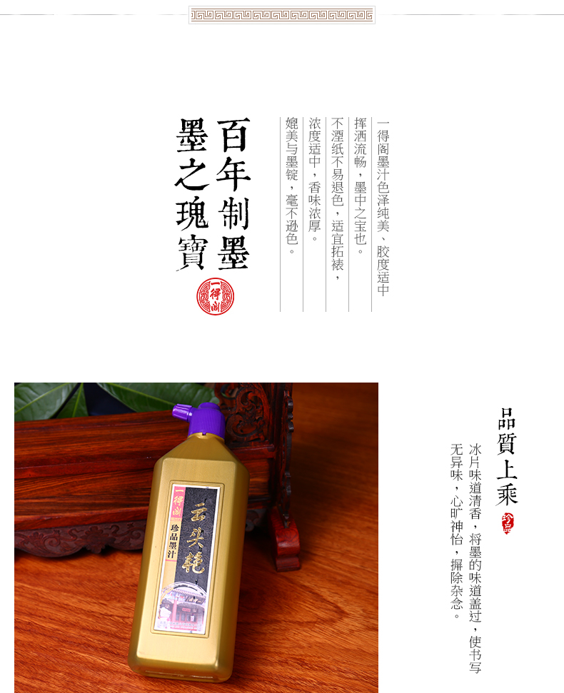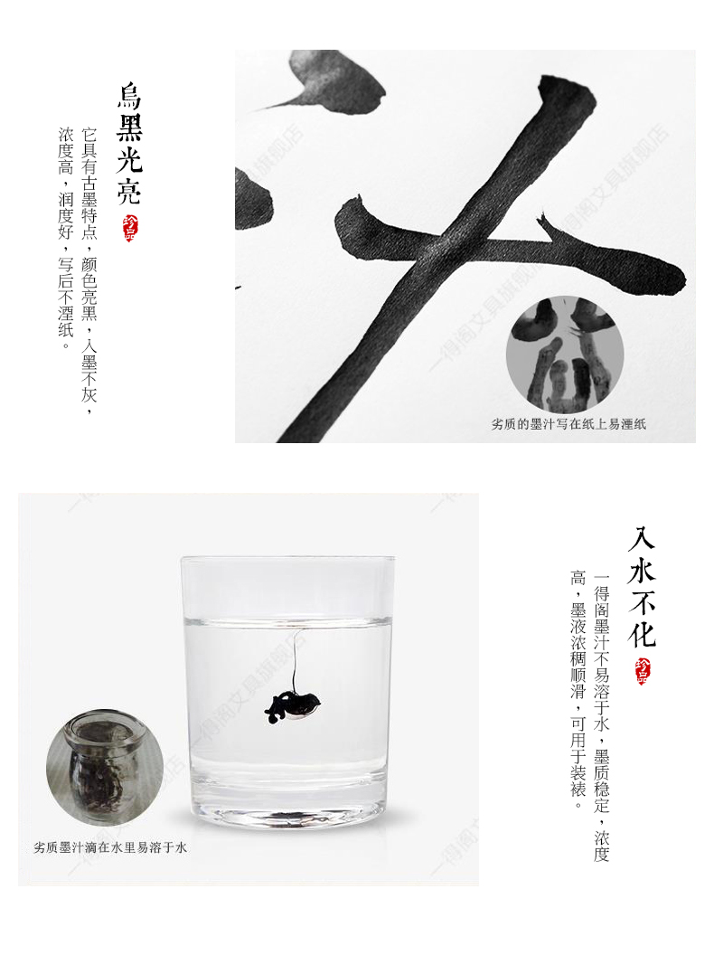 該產品特點:質感細膩,膠度適中,墨色濃重、墨跡清透不失穩(wěn)重、黑中透著紫玉之光,層次感