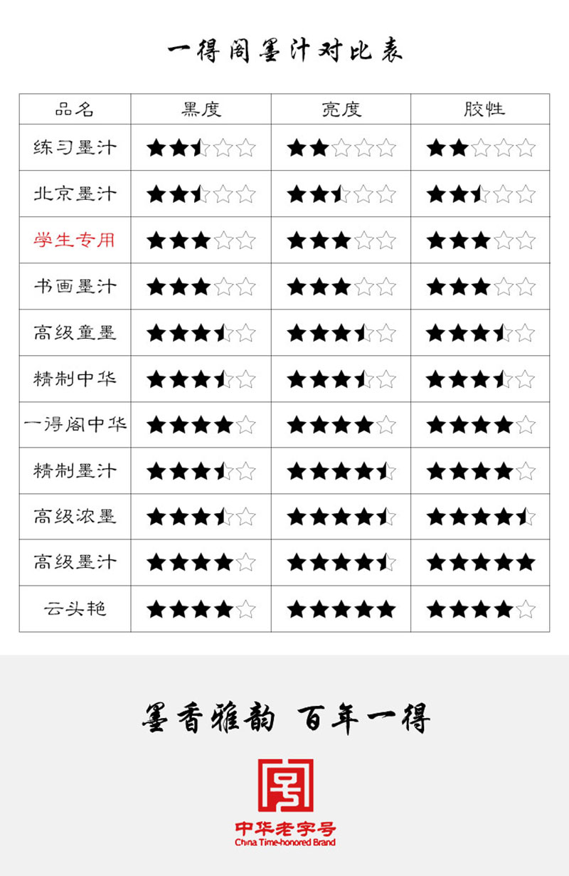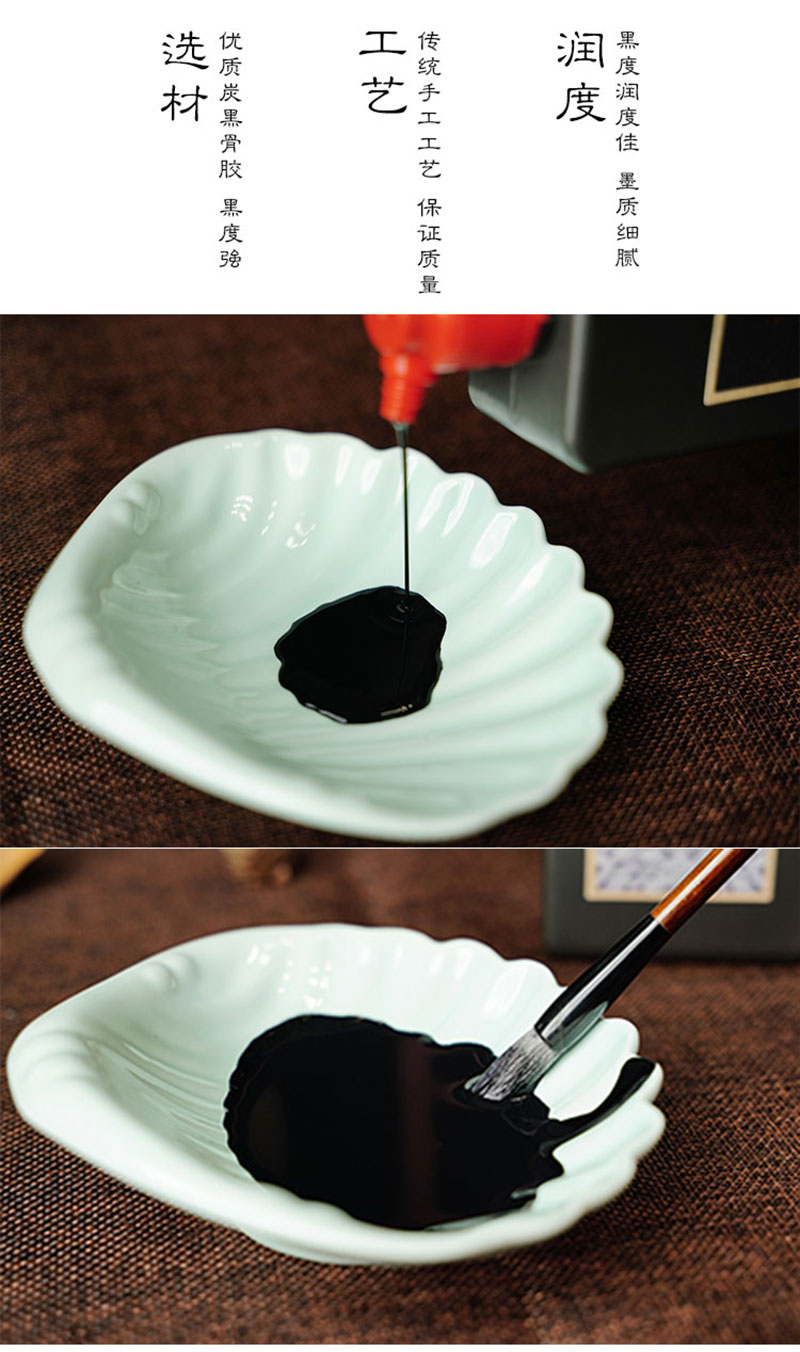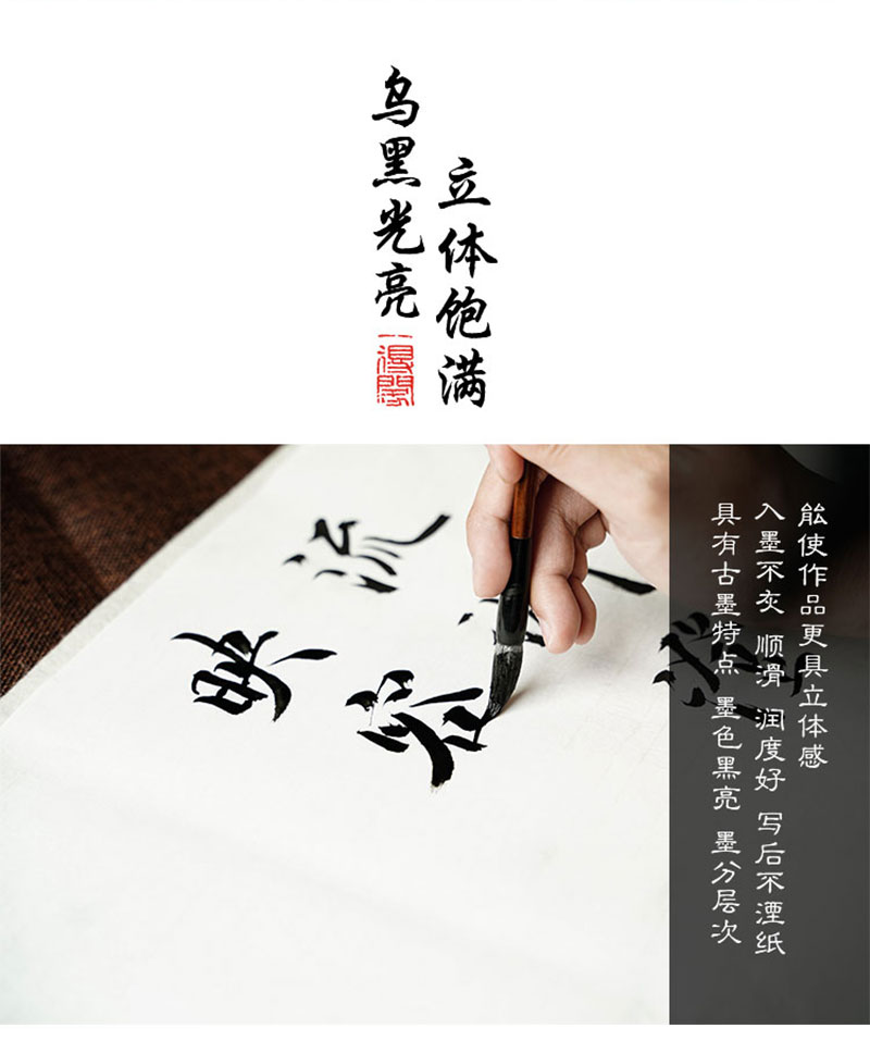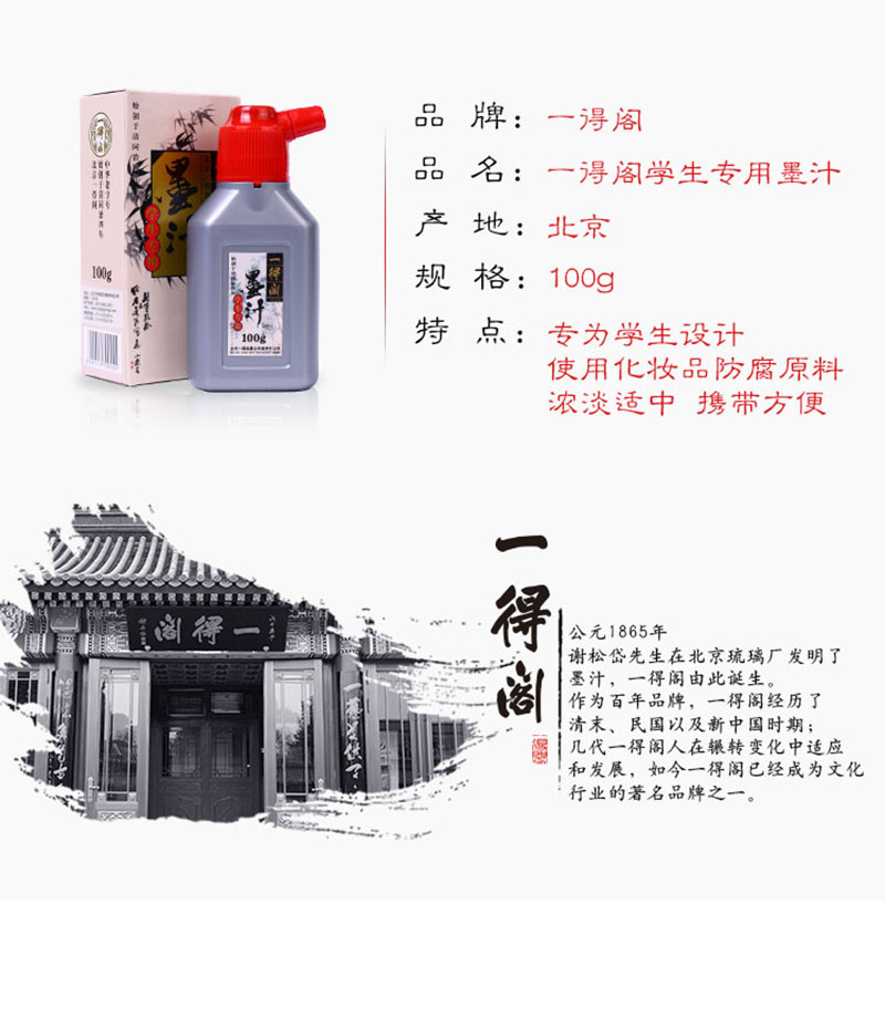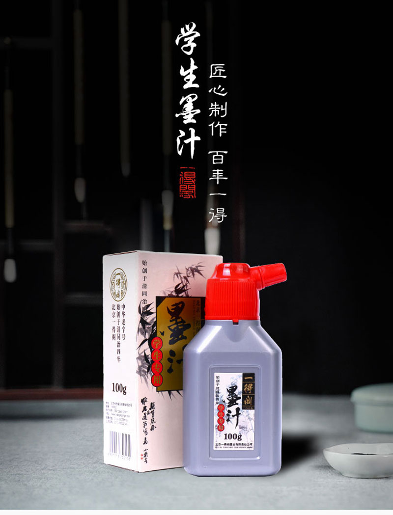 本產(chǎn)品選用優(yōu)質(zhì)材料并采用傳統(tǒng)工藝,專為中小學生制作。是中小學生練習書法繪畫首選產(chǎn)品。其特點墨色濃淡適中,宜書宜畫,因不是作品專用墨汁,所以使用該墨汁的書畫作品不適宜托裱。