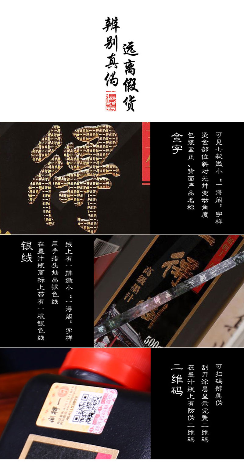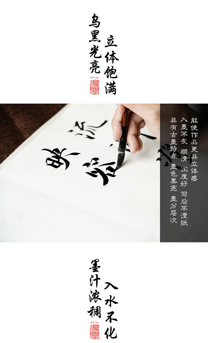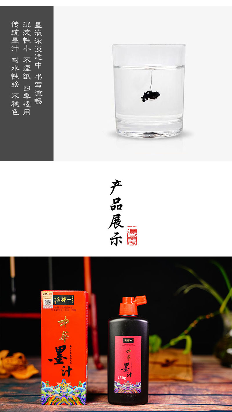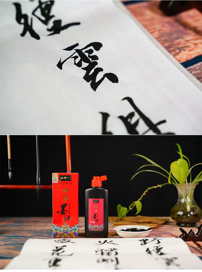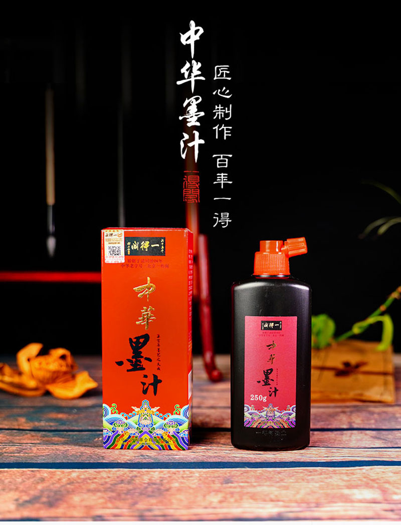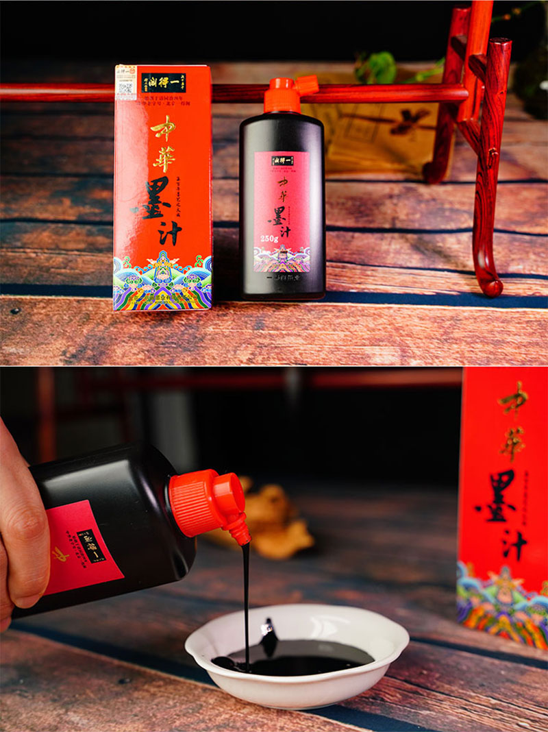 一得閣中華墨汁沿襲中華墨汁一貫的特點(diǎn),并在此基礎(chǔ)上融入新制墨技術(shù)的一款產(chǎn)品。其產(chǎn)品特點(diǎn)為墨質(zhì)細(xì)膩,墨跡烏黑,墨色平和,濃度適中,可少量調(diào)水或不調(diào)水,書寫流暢,適宜書法創(chuàng)作使用。