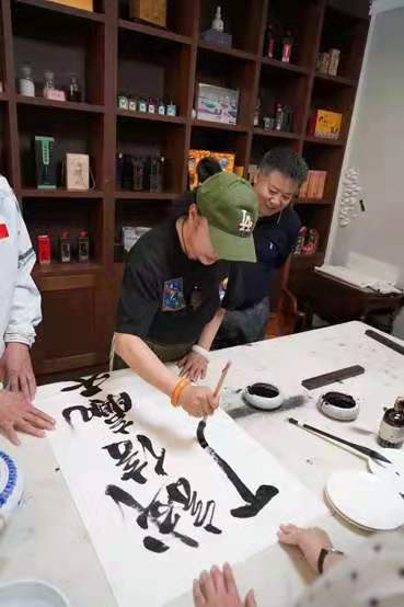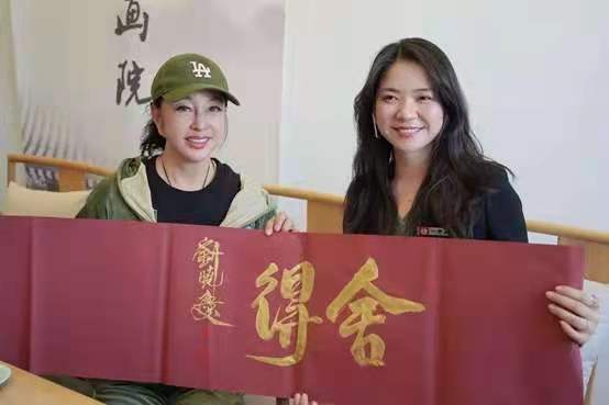 劉曉慶老師與一得閣書畫院執(zhí)行院長馬婷婷女士展示現(xiàn)場用一得閣金墨書寫的書法作品《舍得》