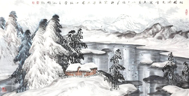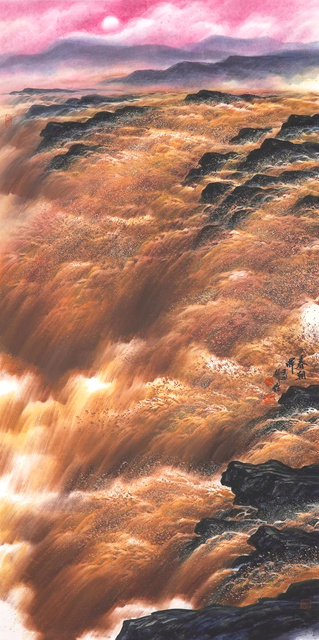 歷代的中國山水畫,大約創(chuàng)造了四種境界。一種寄托家國情懷,或?yàn)樽鎳胶恿鳎嬅褡寰竦呢S碑,或繪優(yōu)美宜居的林泉,抒朝思暮想的鄉(xiāng)情,謳歌安頓心靈的精神家園。又一種欽仰千秋功業(yè),畫大禹治水,繪滿眼梯田,描寫群體改天換地的史詩,表現(xiàn)人在大自然中留下的歷史足跡。第三種探索自然奧秘,畫林海雪原、鳥獸出沒;畫雪域冰川、寺塔斜陽;畫古人從未涉獵的大漠瀚海、古道雄關(guān),體現(xiàn)了人在跨越歷史的大自然面前的震驚。抒寫人對大自然的敬畏。第四種表現(xiàn)天人和諧,畫望秋云神飛揚(yáng),臨秋風(fēng)思浩蕩,使個體的思緒與天地精神往來,實(shí)現(xiàn)心靈的逍遙?;虍嬀G水青山,謳歌生態(tài)文明。