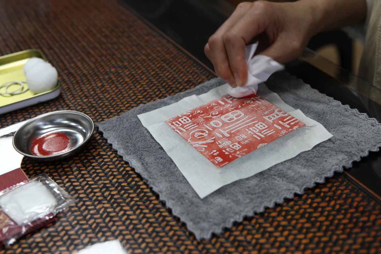 研學(xué)活動包含文化與實(shí)踐兩大部分,一得閣為此次研學(xué)實(shí)踐活動特別準(zhǔn)備了“傳古拓今·墨韻國潮”體驗(yàn)禮盒,內(nèi)含拓版、拓包、朱墨等拓印所需全部用具。拓印是我國一項(xiàng)古老的傳統(tǒng)技藝,使用宣紙和墨汁可將碑文上的文字圖案,清晰拷貝出來,是我國最早的“印刷術(shù)”。同時(shí),拓印也是一得閣古法制墨最后一步“檢驗(yàn)”里的重要環(huán)節(jié),通過拓印可以清晰直接地觀察到墨汁的顏色與效果。