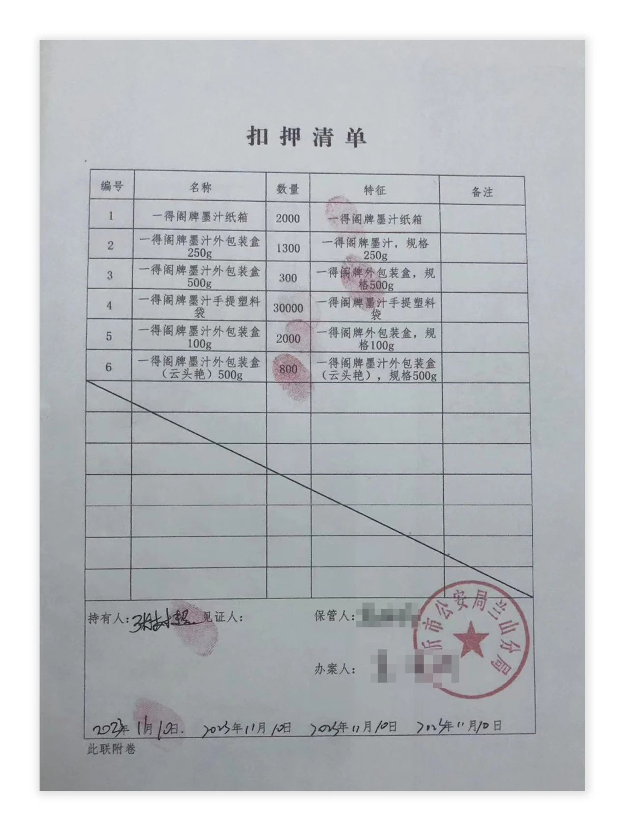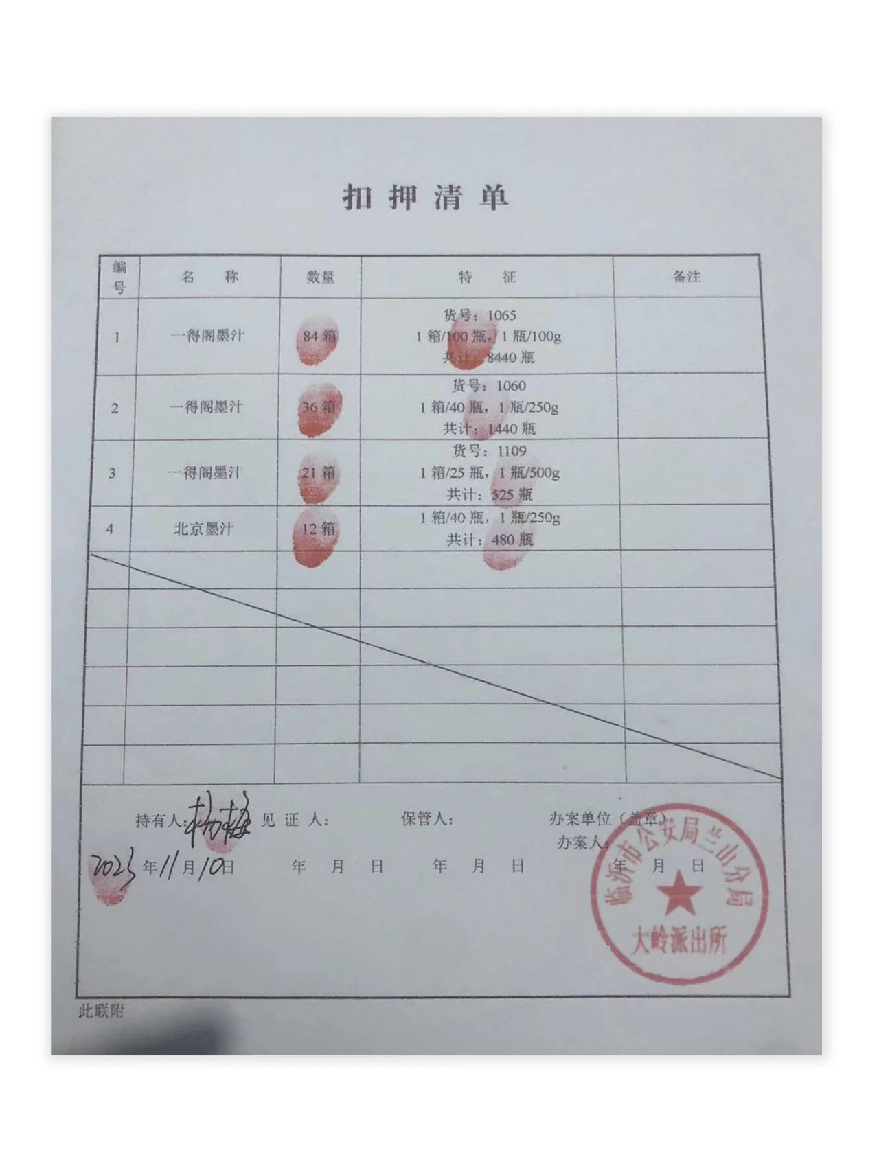 近日,山東省臨沂市公安局藍(lán)山分局查獲扣押一批假冒一得閣注冊商標(biāo)的偽造產(chǎn)品,相關(guān)涉事人員已被刑事拘留,等待刑事審判。此次查獲的涉案產(chǎn)品數(shù)量龐大,覆蓋一得閣多個經(jīng)典產(chǎn)品,包括一得閣精制、云頭艷、書畫、北京等多個產(chǎn)品合計10885瓶。同時也發(fā)現(xiàn)了大量假冒包裝材料,其中包括一得閣紙箱、外包裝盒、手提塑料袋、防偽標(biāo)等共計超70000份。