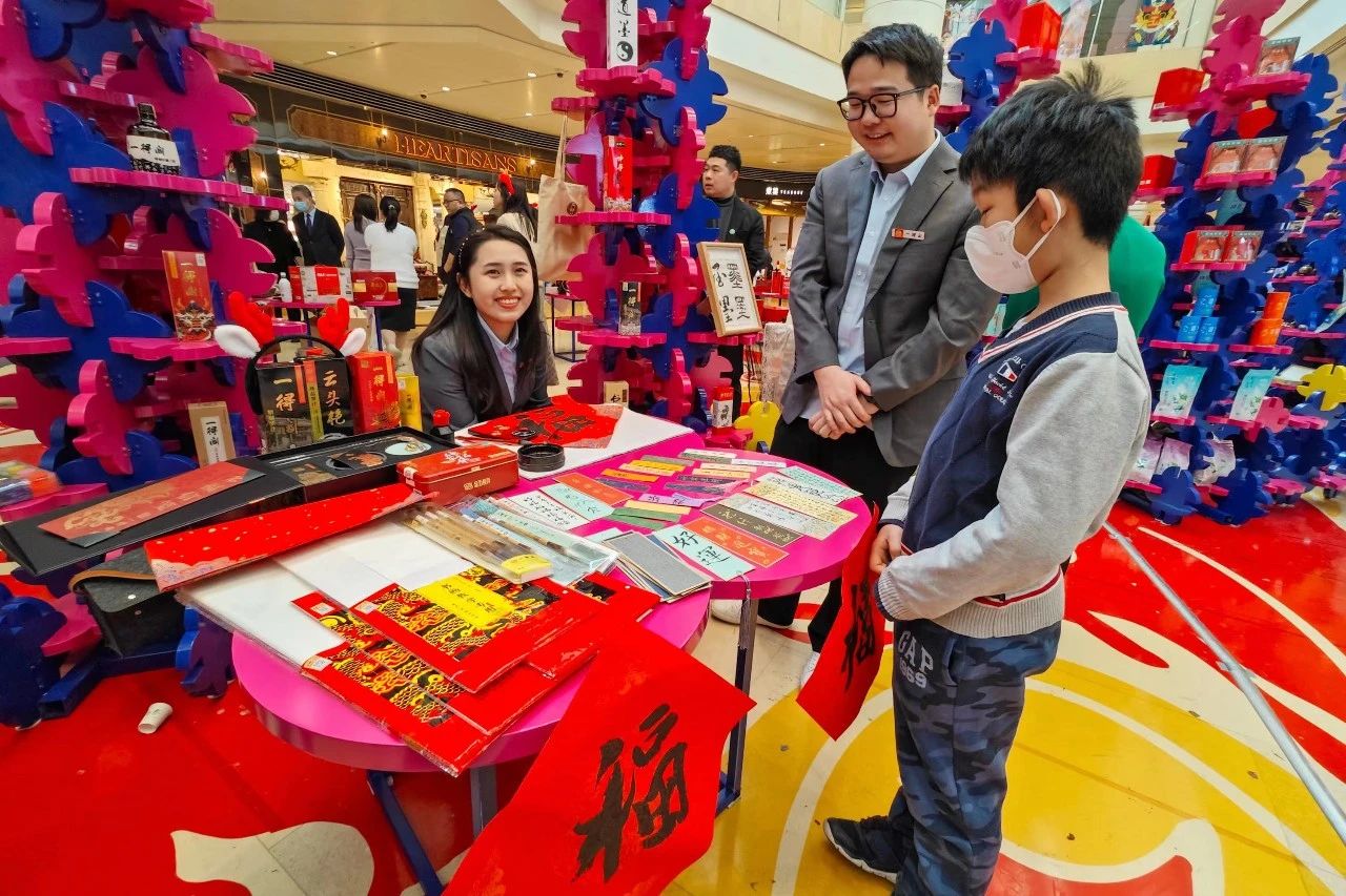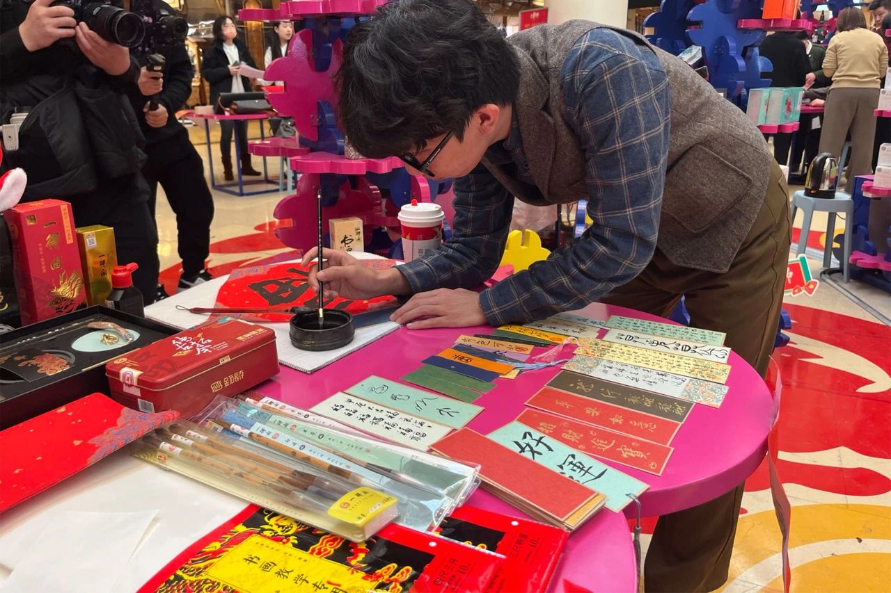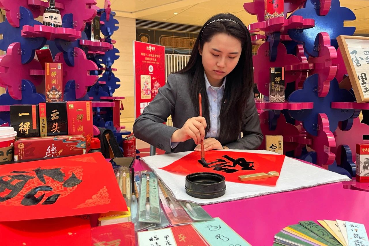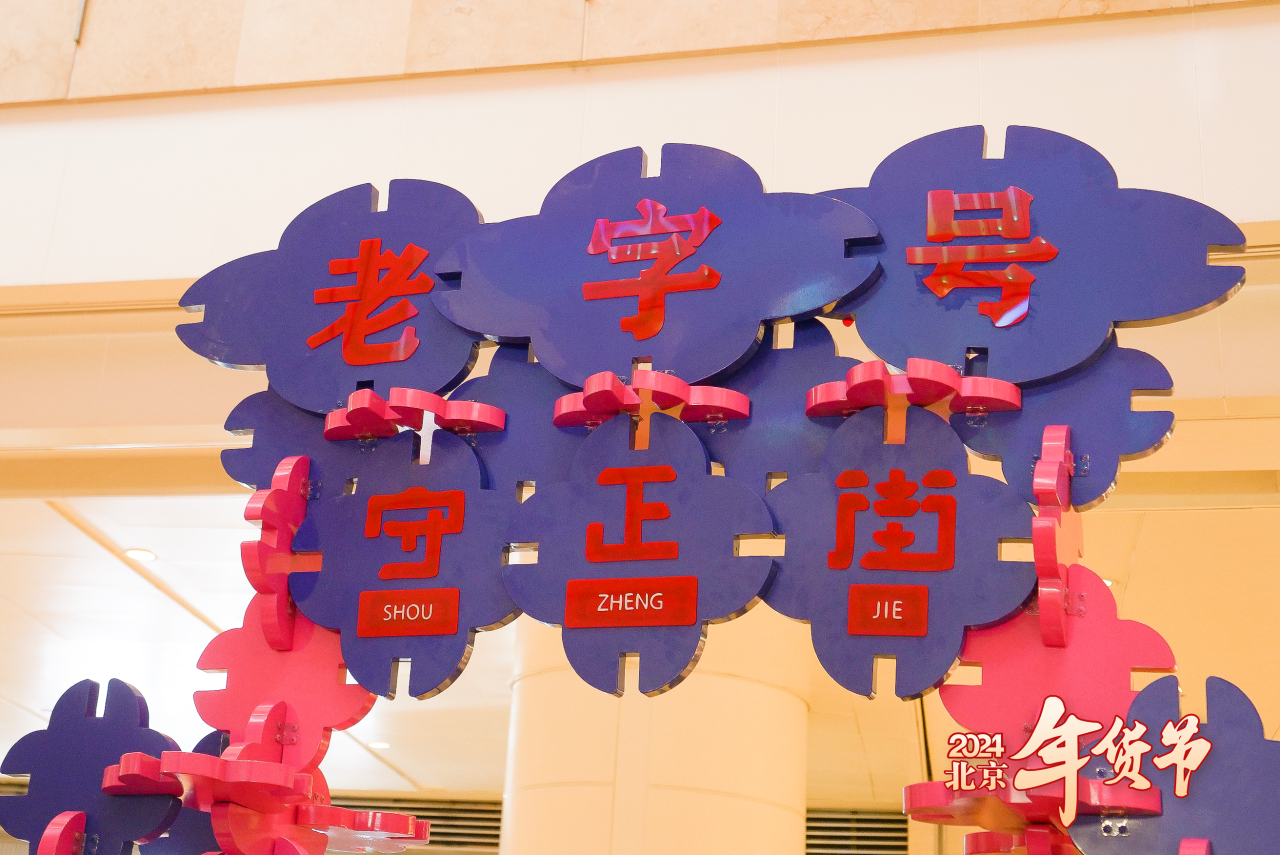 1月18日,由北京市商務(wù)局主辦、北京老字號協(xié)會承辦、國貿(mào)商城支持舉辦的“2024北京年貨節(jié)老字號藝品雅集”在國貿(mào)商城北區(qū)舉行開街儀式。中華老字號一得閣現(xiàn)場為市民寫“?!弊炙妥8?,商城中庭位置變成熱熱鬧鬧的“老字號守正街”。