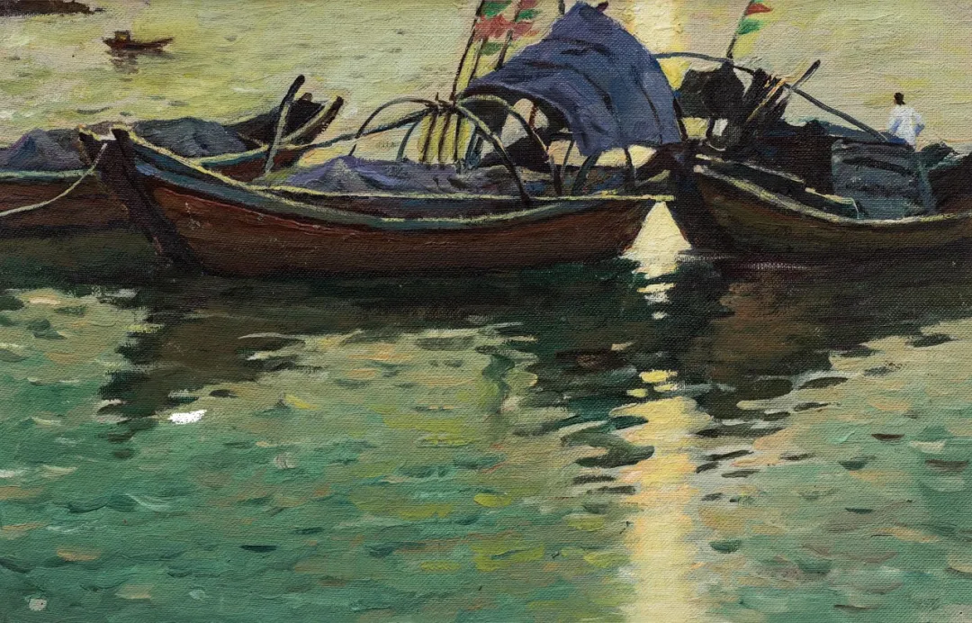 韓植墨 油畫 晨光中的泊船25x39厘米