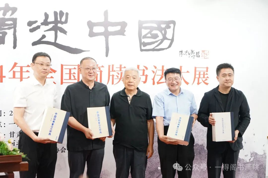 開幕式上,北京簡帛書法藝術(shù)院院長吳巍先生(中)為甘肅簡牘博物館捐贈主編的四部卷《中國簡帛書法大字典》,甘肅簡牘博物館館長朱建軍(左二)接受了捐贈。