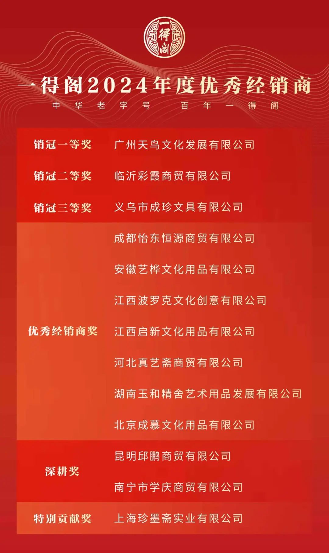 本次大會(huì)重點(diǎn)內(nèi)容是總結(jié)2024年銷售工作、公布2025年銷售政策及發(fā)展布局,分享一得閣最新推出的系列產(chǎn)品。 王松致辭 北京一得閣銷售有限責(zé)任公司總經(jīng)理 易超致辭 北京一得閣銷售有限責(zé)任公司副總經(jīng)理 于正揚(yáng)致辭 北京一得閣一得閣電商中心經(jīng)理 白冰致辭 北京一得閣墨業(yè)有限責(zé)任公司總經(jīng)理 今年是中華老字號(hào)一得閣一百六十周年,白總首先向大家簡(jiǎn)述了一得閣今年在品牌和產(chǎn)品上所獲得的眾多榮譽(yù)、一得閣在2024年作為承辦單位主持的各種行業(yè)活動(dòng),再次強(qiáng)調(diào)“品牌”的重要性,未來(lái)一得閣也將繼續(xù)增強(qiáng)品牌影響力,與經(jīng)銷商客戶共繪傳統(tǒng)文化與現(xiàn)代商業(yè)交融的新畫卷! 攜手并肩 共創(chuàng)佳績(jī) 為了表彰優(yōu)秀經(jīng)銷商的杰出表現(xiàn),大會(huì)特別設(shè)置了隆重的頒獎(jiǎng)環(huán)節(jié)。一系列獎(jiǎng)項(xiàng)花落銷售業(yè)績(jī)斐然、市場(chǎng)拓展有術(shù)和有特別貢獻(xiàn)的優(yōu)秀經(jīng)銷商。這不僅是對(duì)獲獎(jiǎng)?wù)叩恼J(rèn)可,更為全體經(jīng)銷商樹立了努力的方向。 完整獲獎(jiǎng)名單 會(huì)議結(jié)束,大家來(lái)到一得閣非遺博物館,感受一得閣一百六十年的歷史文化,體驗(yàn)非遺魅力。 本次經(jīng)銷商大會(huì)的圓滿召開,進(jìn)一步鞏固了一得閣與核心經(jīng)銷商之間的合作關(guān)系,為未來(lái)的業(yè)務(wù)拓展奠定了堅(jiān)實(shí)基礎(chǔ)。展望未來(lái),雙方將攜手并進(jìn),共同致力于市場(chǎng)開拓,以創(chuàng)新驅(qū)動(dòng)發(fā)展,實(shí)現(xiàn)共贏的美好愿景。對(duì)經(jīng)銷商們的到來(lái)表示熱烈歡迎,在總結(jié)2024年一得閣銷售情況與行業(yè)趨勢(shì)解讀的基礎(chǔ)上,提出2025年的新方向:創(chuàng)新、發(fā)展與融合,以"三維驅(qū)動(dòng)"重塑發(fā)展格局,深化經(jīng)銷商客戶賦能體系,讓每位經(jīng)銷商成為一得閣文化生態(tài)的共建者和受益者。